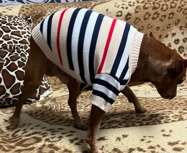 A wonderful jacket. Excellent quality. The material is pleasant to the touch, stretches. On our zvergpinscher (the length on the back of the dog is 30 cm) size M fit perfectly. Delivery was long to Ukraine, but waited;)